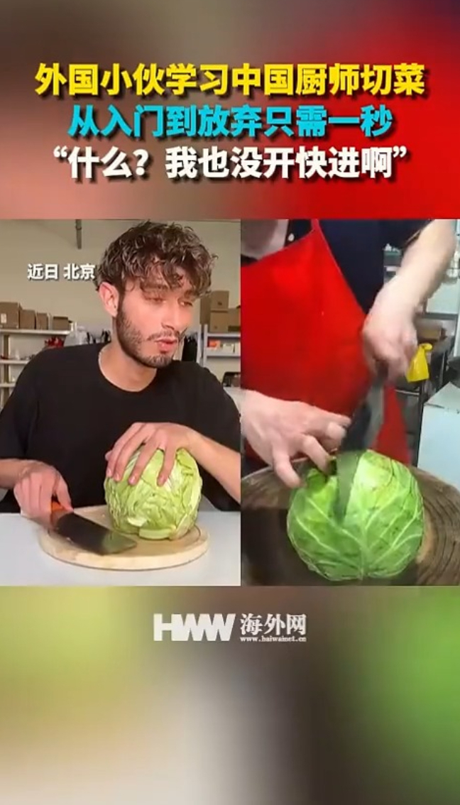 外国小伙学习中国厨师切菜,从入门到放弃只需一秒