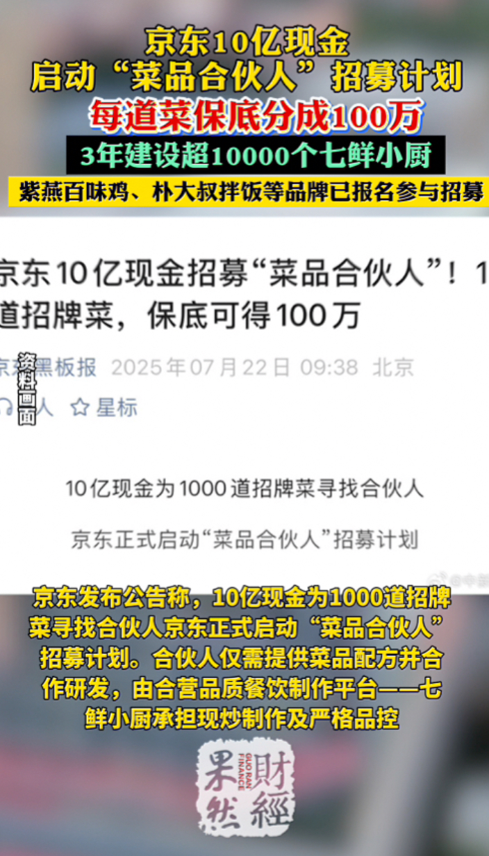 果然财经|京东招募“菜品合伙人”,每道菜保底分成一百万