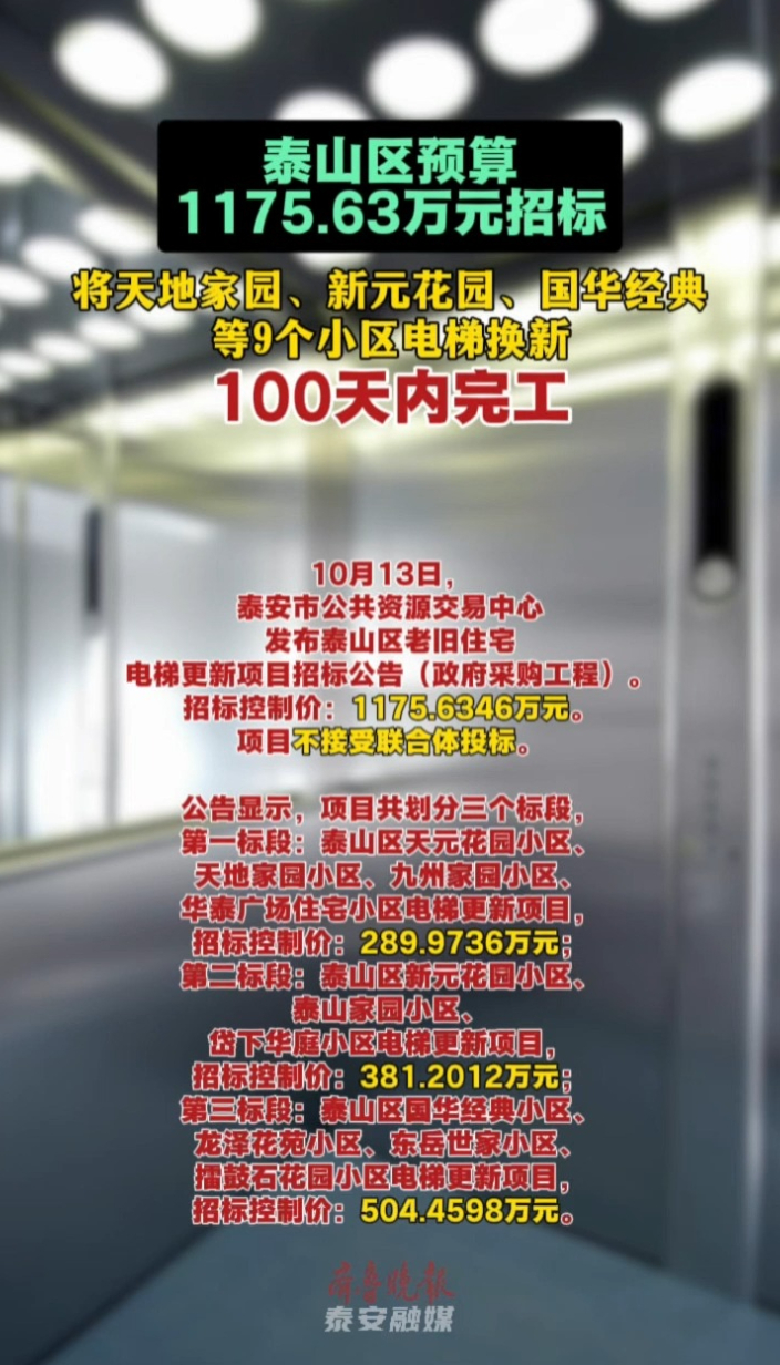 果然视频丨泰山区预算1175.63万元招标,9个小区77台电梯将焕新,100天内完工