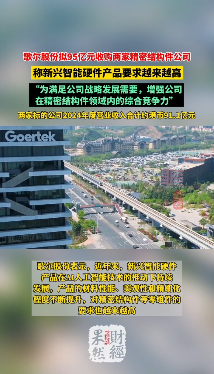 果然财经|歌尔股份拟95亿元收购两家精密结构件公司