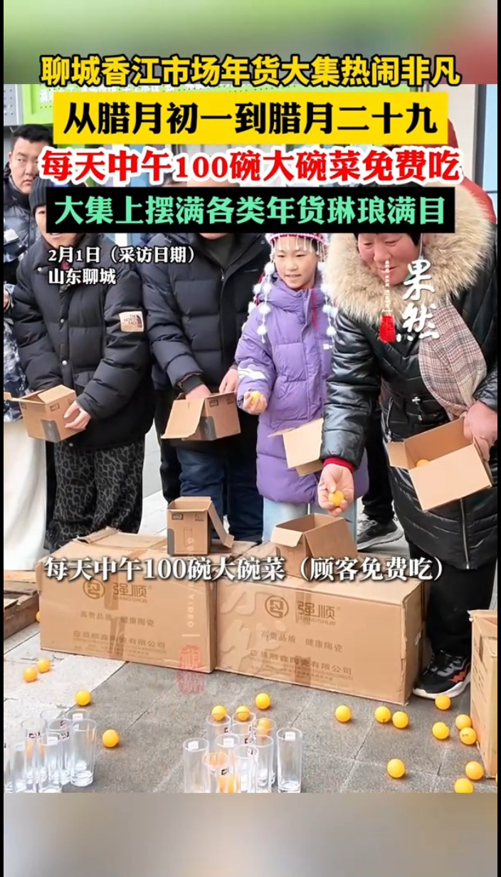 聊城香江市场年货大集热闹非凡,每天中午100碗大碗菜免费吃